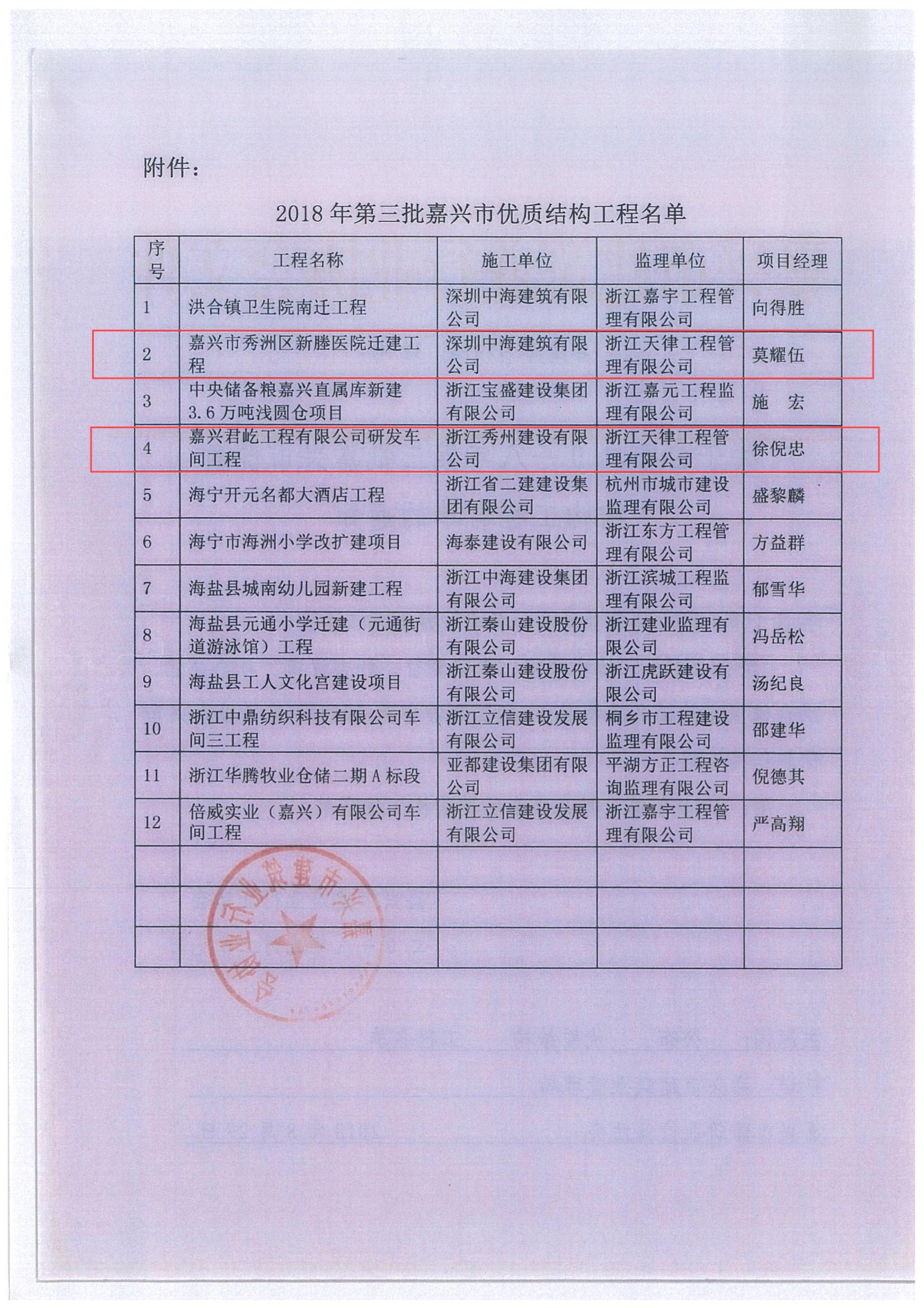 2018年嘉興市第四批優質結構