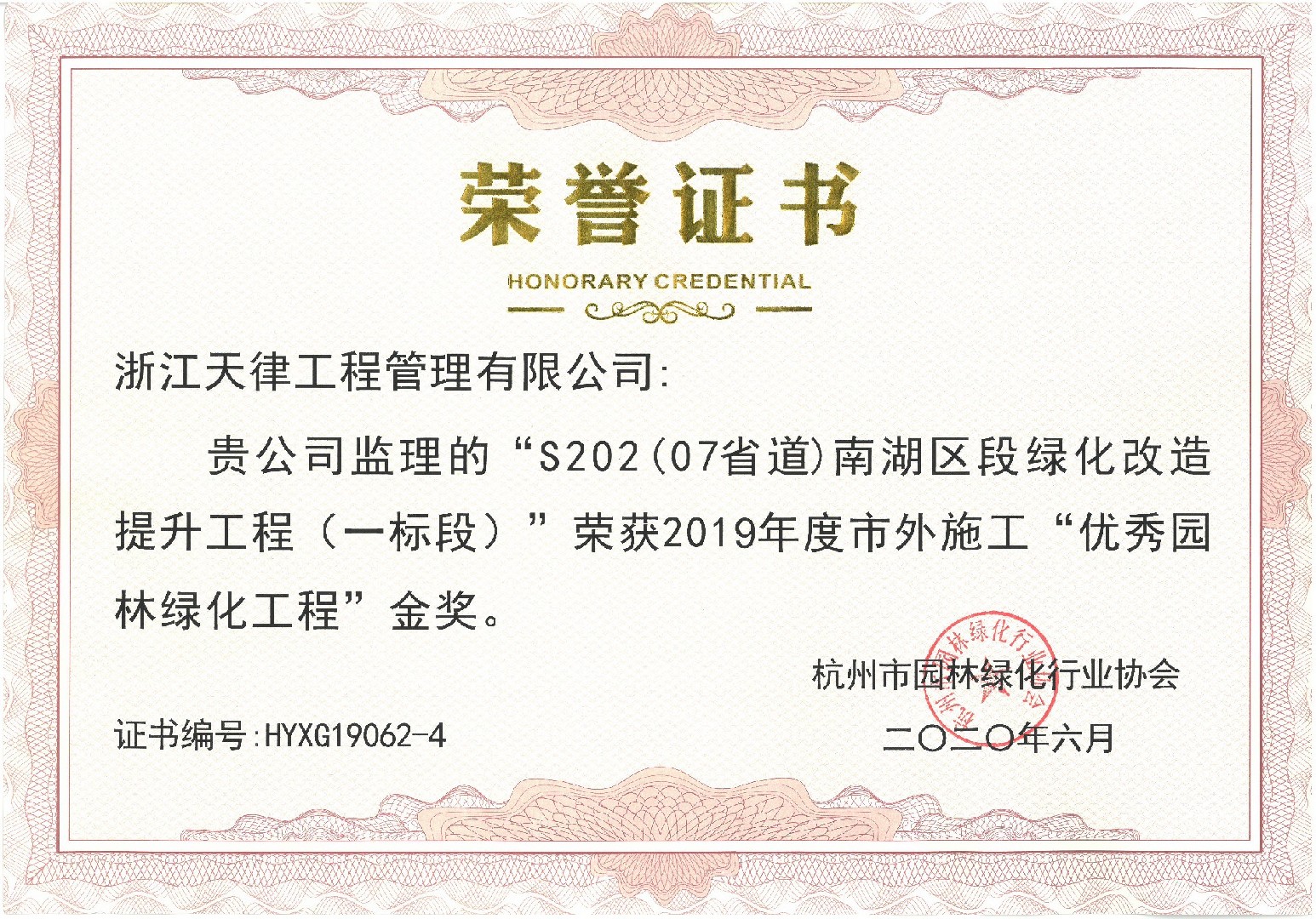 2019年度杭州市優秀園林綠化工程(市外項目)金獎