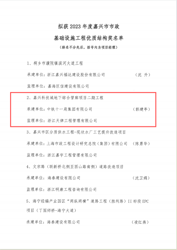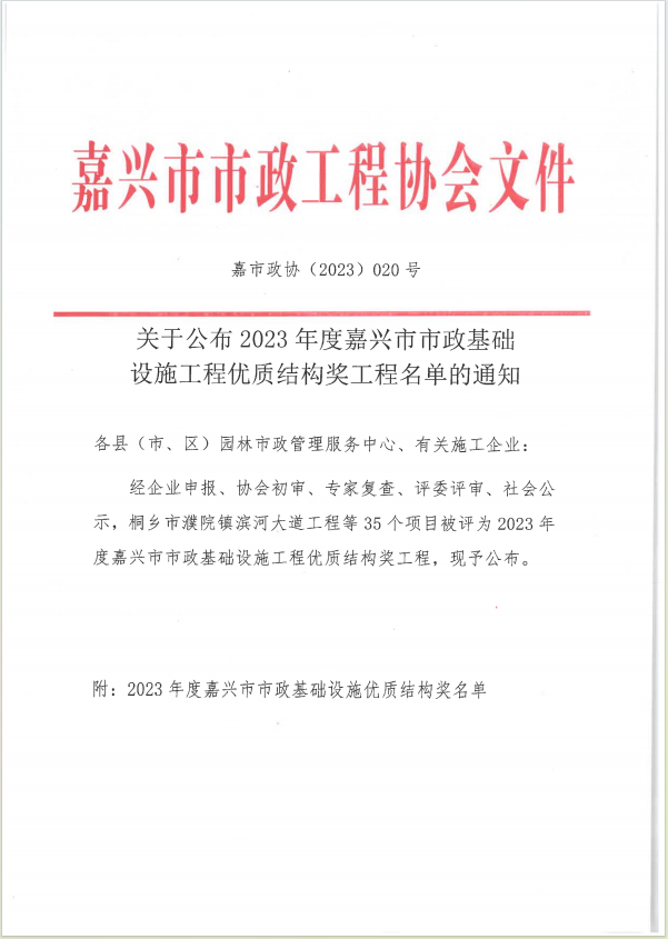 2023年度嘉興市市政基礎(chǔ)設(shè)施工程優(yōu)質(zhì)結(jié)構(gòu)獎