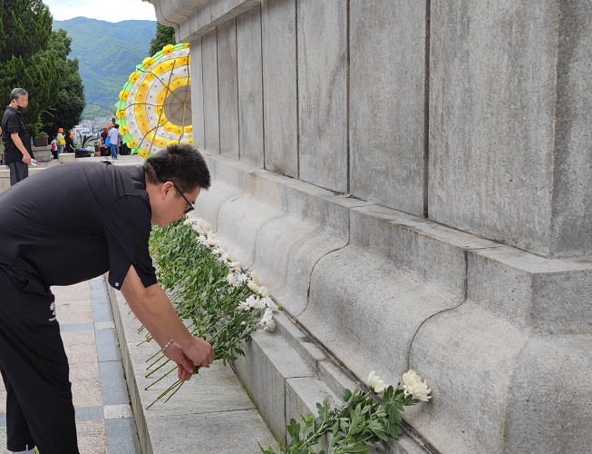 大家佇立在紀(jì)念碑前向革命烈士默哀,深切緬懷革命先烈的英雄事跡。繞碑而行,輕撫碑身,最后獻(xiàn)上事先準(zhǔn)備好的鮮花,每個(gè)人的內(nèi)心是復(fù)雜的,翻涌著對(duì)先烈們的追思、崇敬、感恩……,但無一不被他們的愛國(guó)主義情懷深深感動(dòng)。