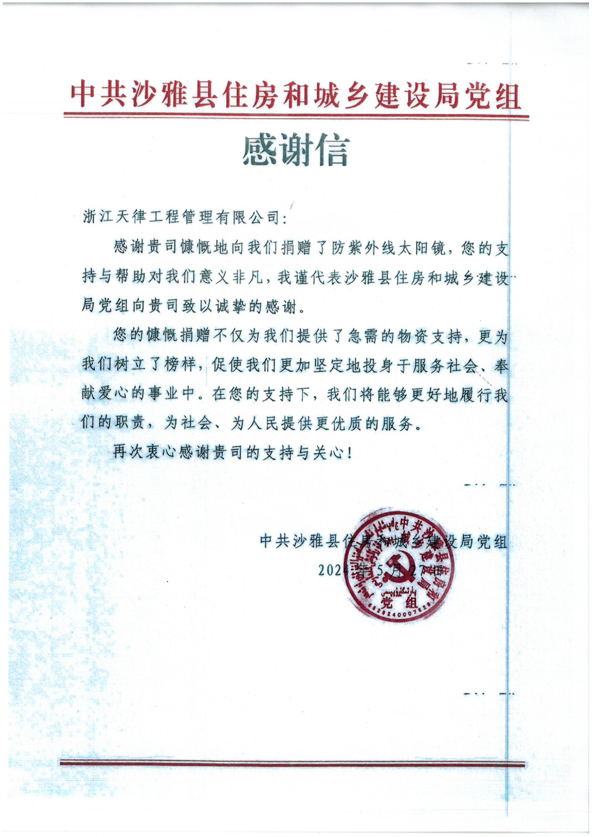 2024年中共沙雅縣住房和城鄉建設局黨組感謝信